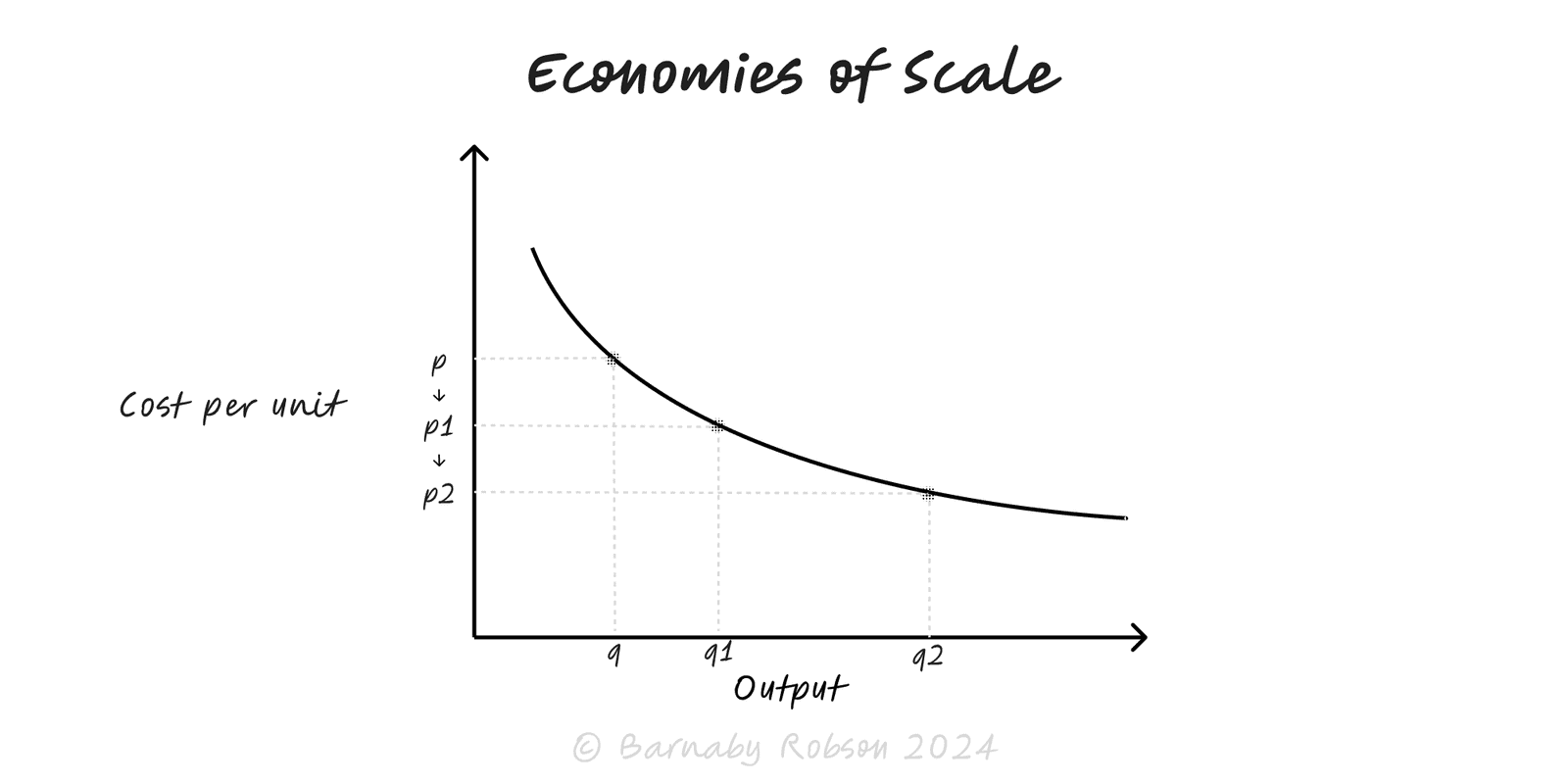 Produce more to lower average cost by spreading fixed costs, improving specialisation and buying better—until coordination costs bite.